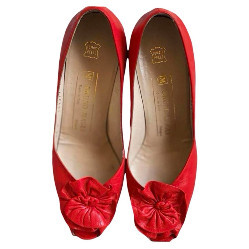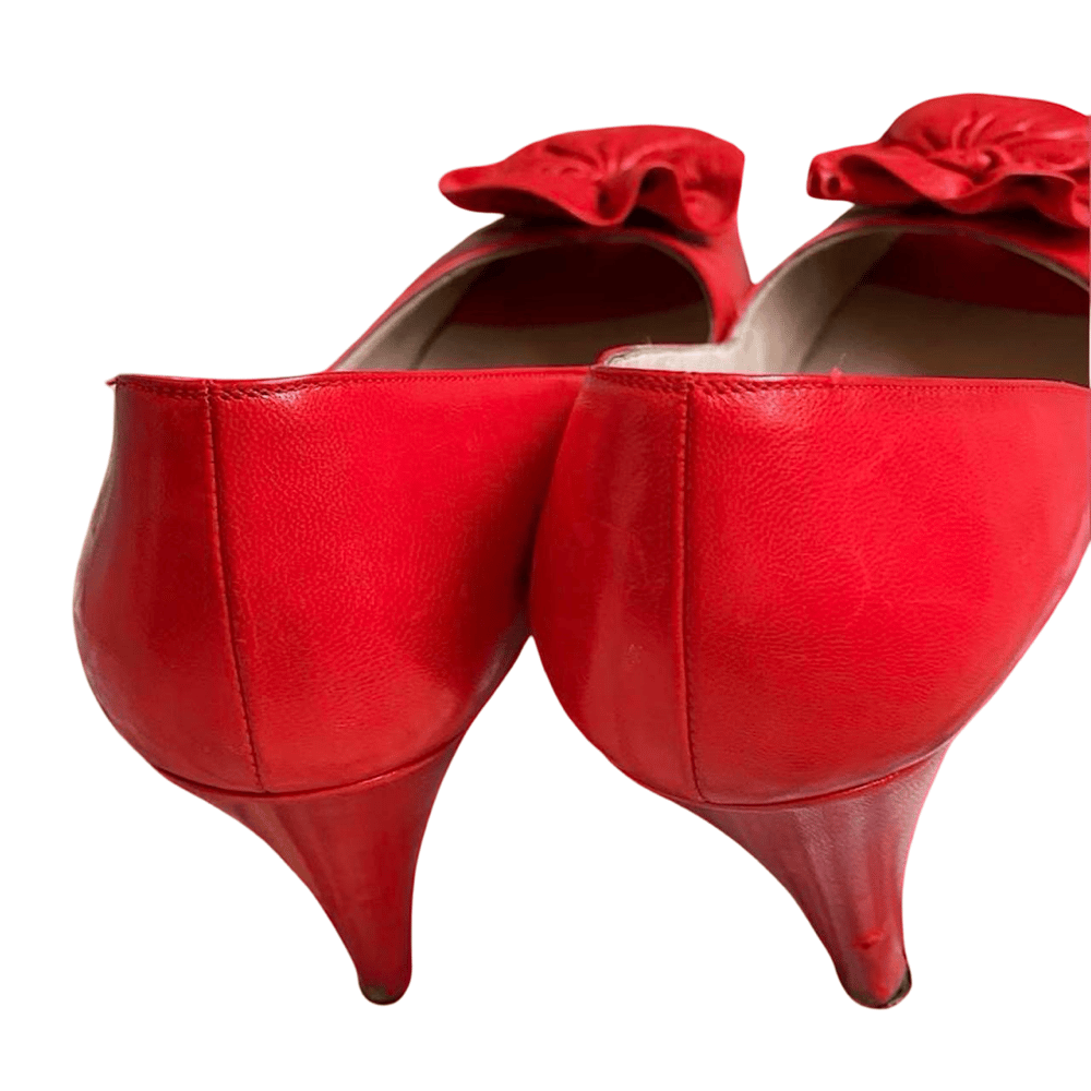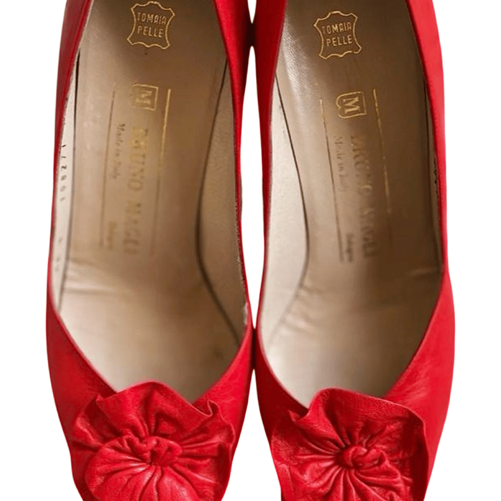 1980s Red Bruno Magli Leather Peep Toe Heels- Flower Accent
