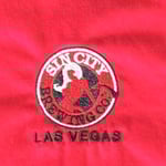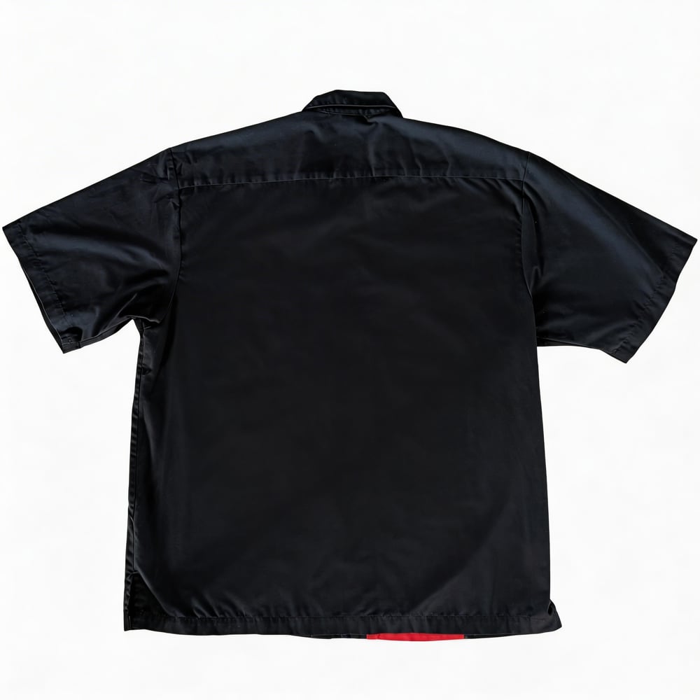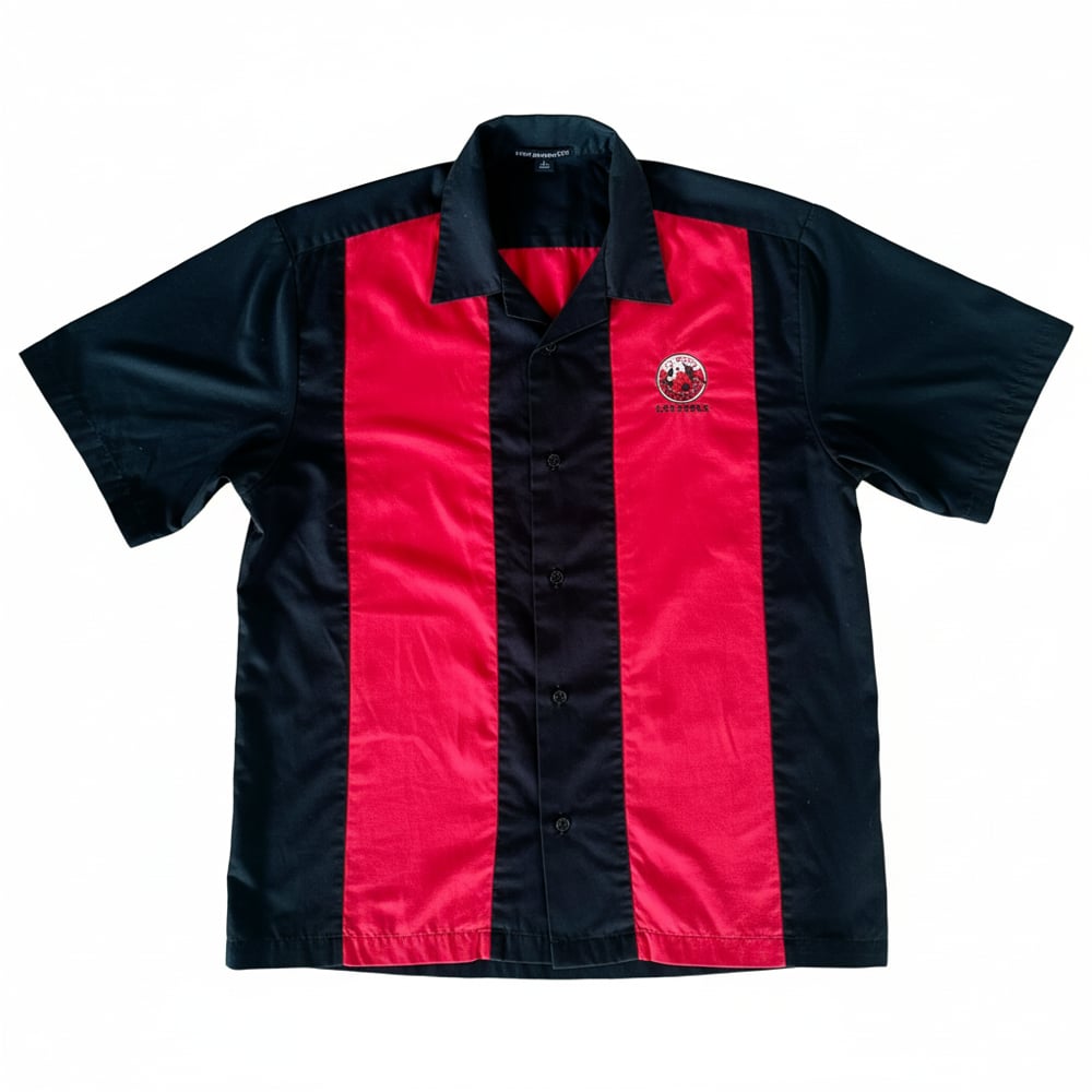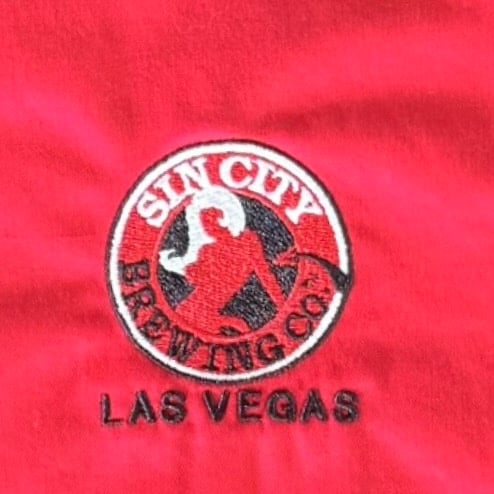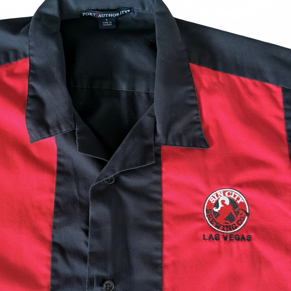Unique Details: Embroidered Sin City Brewing Co logo, red vertical accent panel, button up, collar, small side slits, medium fabric weight, 90s style, and short sleeves.