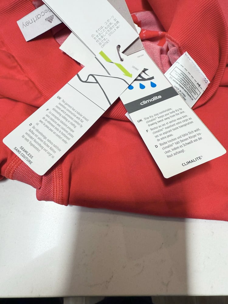 Unique Details: Tags attached, Climalite fabric, tubular design making the garment almost seamless, Stella McCartney edition, floral design with woven color print, the back of the garment has the floral design at the waist, ribbed waist band, ribbed hem with light pink stripe, adidas branding at left side hem, and unique leggings!