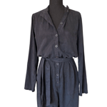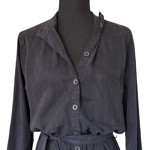 Unique Details: Textured soft fabric, light black gray color, button front, belt loops, waist tie, v stitching at back, front pocket, pant pockets, round collar, and long sleeves.