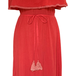 Note: there is a light shining on the skirt in the photos and it is not a spot. Cotton gauze fabric, skirt is lined, waist tie with tassels, off the shoulder elastic fit, decorative trim accents, flounce hem, elastic waist band, 70s vintage style, beach boho, midweight fabric, and maxi length.