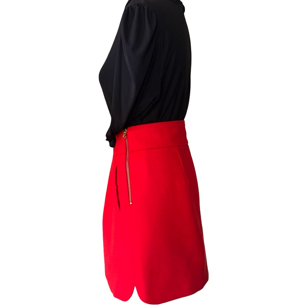 Unique Details: Wool fabric, gold metal size zipper, vertical cigarette pockets, wide waistband lined with gross grain , beautiful red hue, rounded side slits, mini skirt, and lined.