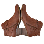 Unique Details: Carmel brown color, flat brass stud accent, buckle, inner zipper enclosure, block heel, almond toe, and strappy design.