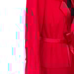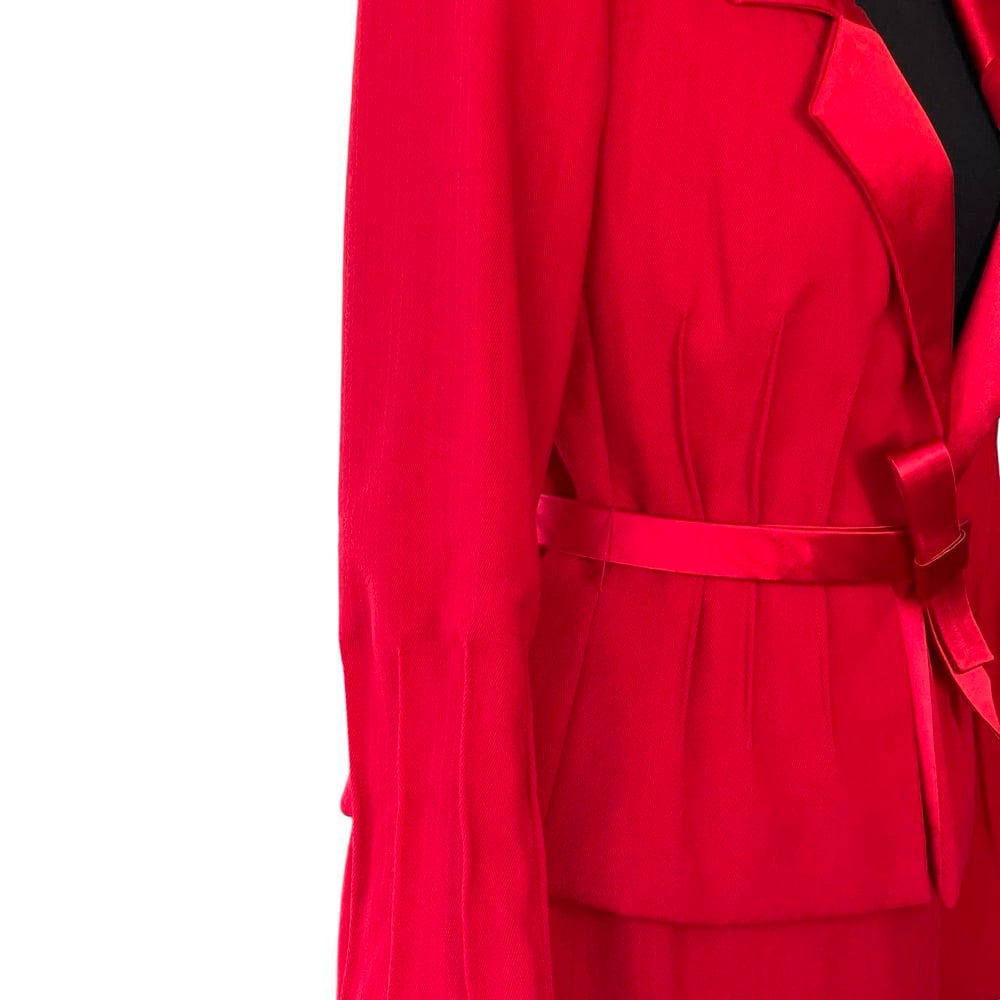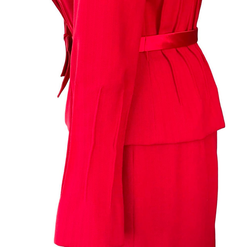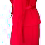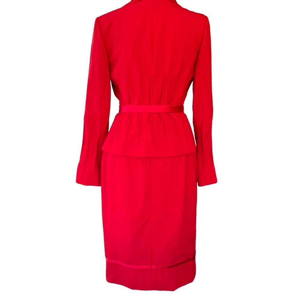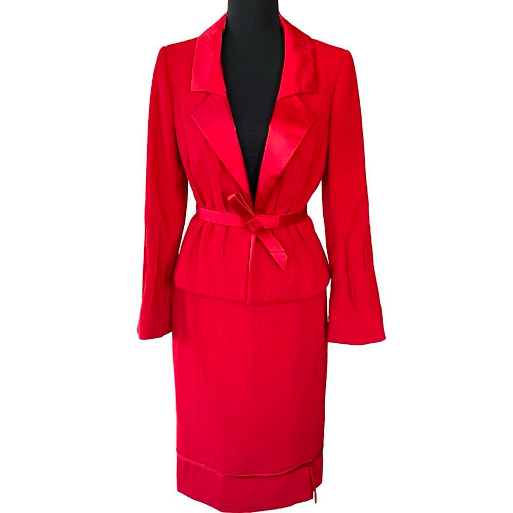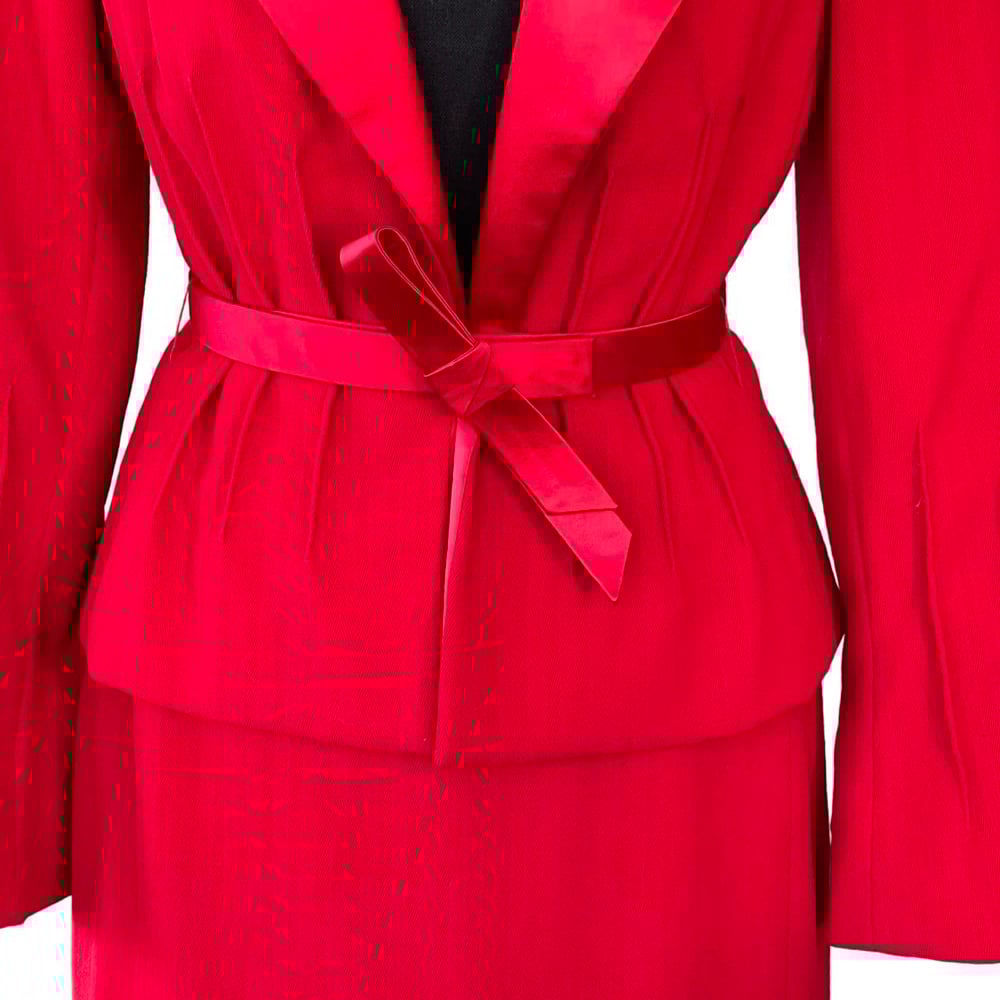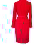 Red woven wool material, with satin type accent at lapel and piping, fully lined on the jacket and skirt. Single button jacket enclosure, vertical accent designs at the waist line, and sleeves. Slight flare at sleeve, double hook and eye enclosure on skirt opening, back zipper, piping accent, satin type material accent.