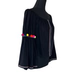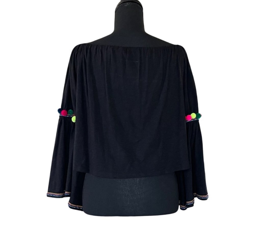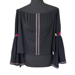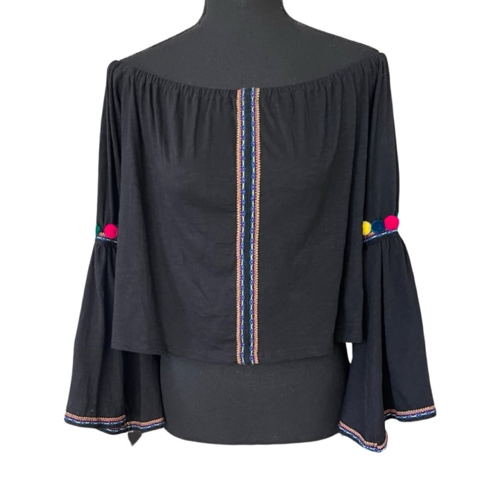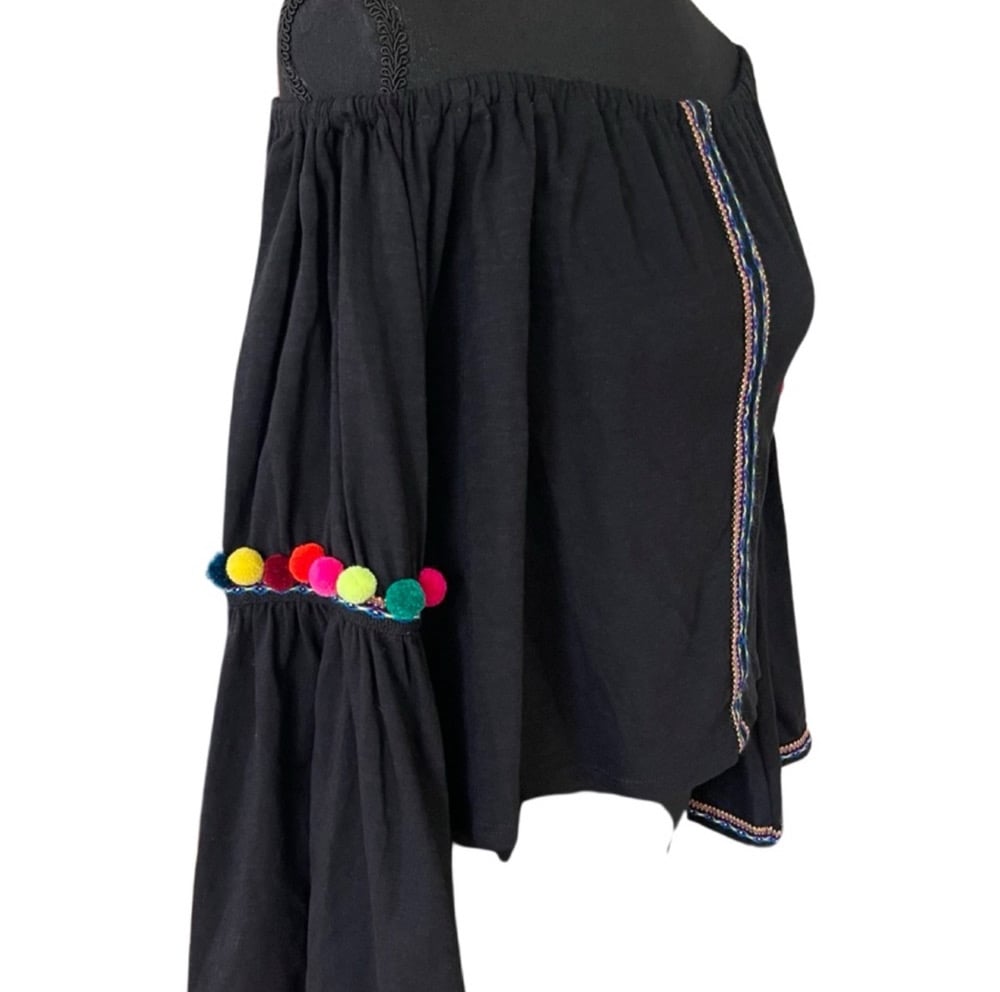Pitusa Off The Shoulder Black Pom Pom Bell Sleeve Top - One Size Festival Boho