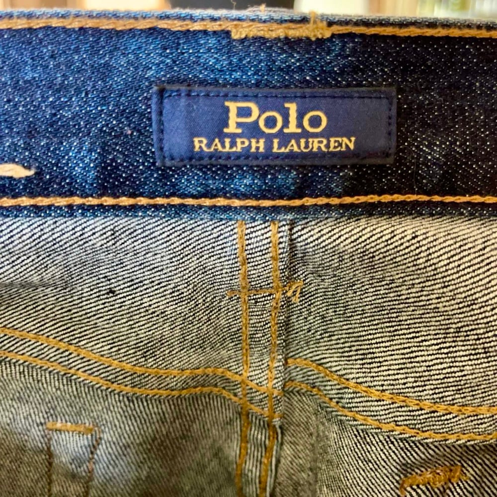 Vintage soutache embroidery at hem, ankle-grazing length, mid-rise, straight through the leg, belt loops, zip fly with ornamental button enclosure,five pocket styling with signature "PRL 67" on metal rivets, “Polo” tag on coin pocket, distressed frayed natural rip areas on front leg, and distressed wash.