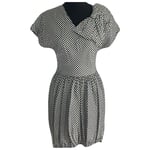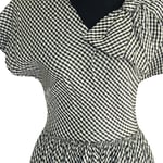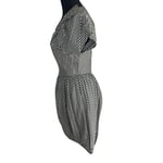 Black and white rayon taffeta feeling fabric, bow accent, darts, back zipper, short sleeve, hi- low bubble hem, and gather in skirt. Talon metal zipper.