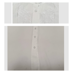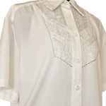 Unique Details: Embroidered front design with lace accent, embroidered collars, detailed button design, short sleeve, slightly transparent, and eggshell white color.