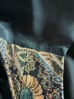 Unique Details: 1990s Vintage, woven cotton blend multicolor paisley tapestry fabric, black acetate back, princess seams, 5 button front, pointed hem accent, 2.5 inch side slits, and black inner lining.