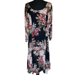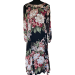 1990s staple! Sheer fabric, floral print, princess seams, flattering flowy gussets toward the bottom of the skirt, scoop neck, 3/4 length sleeves that are blousy and tapered at end, and gorgeous unique print pattern. Belt not included.