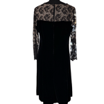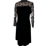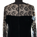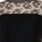 This dress is gorgeous vintage condition and quality. It does not look worn, as there is also a paper tag at the back. Scalloped black lace with beige underlay, sheer lace sleeves, double hook and eye back enclosure with large keyhole opening, metal zipper at back, darts, princess seams, velvet fabric, lined, midi length and fabulous vintage piece. There is a rainbow effect showing on the lace which is due to lighting - the lace is black.
