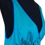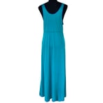 Gorgeous construction, purple piping at upper bodice and hem, peacock feather style embroidery, maxi length, back elastic, v neck and slightly sheer.