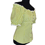 Unique Details: Dirndl folk top, gingham pattern, brown tone front buttons, off the shoulder elastic collar, elastic puff sleeve, woven lace trim, extra button on the inside of garment,and fitted bodice.