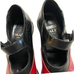 Red and black two tone, round button buckle enclosure, oxford design, stacked block heel, rounded toe box, and beautiful Italian craftsmanship.
