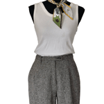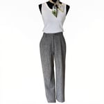 Virgin Wool, zip front, pockets at front, belt loops, lined, slightly tapered, high waist, inner button at waist and outer button enclosure, and textured speckled wool. Has not been dry cleaned.