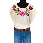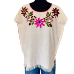 Unique Details: Colorful hand embroidered floral design at front top, embroidery at side seams and collar, boxy fit, imported from Mexico, seam at hem with natural cotton fringe, and cream color cotton.