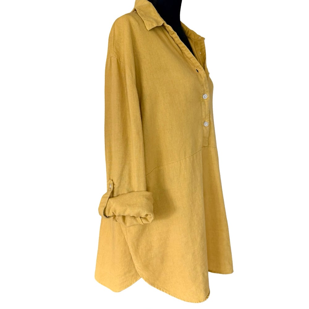 Unique Details: Shirt Dress style, collar, long sleeves, roll tab sleeve, rounded hem with side slits, abalone style buttons, and linen blend material.